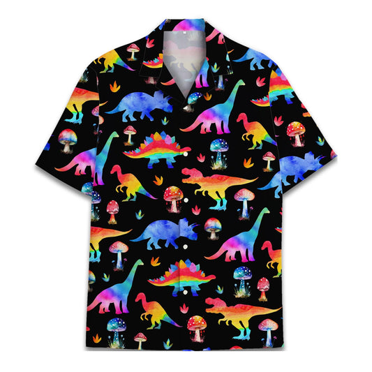 Rainbow Dinosaur Hawaiian Shirt – Colorful Dino & Mushroom Print