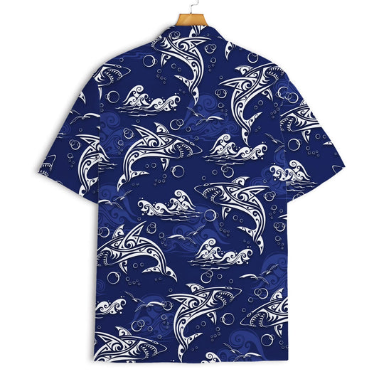 Tribal Shark Hawaiian Shirt – Navy Blue Ocean Aloha Shirt for Men