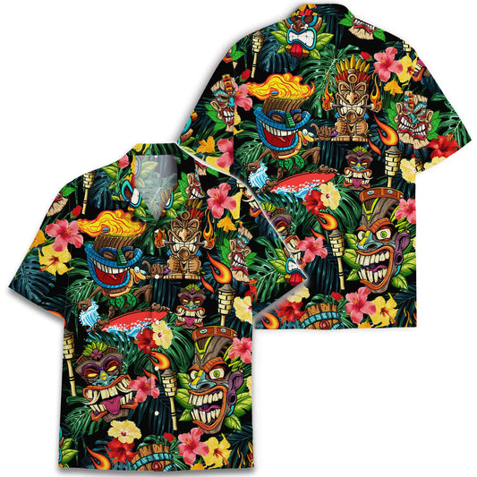 Tiki Fire Hawaiian Shirt – Funny Cartoon Luau Aloha Shirt with Torches & Flowers
