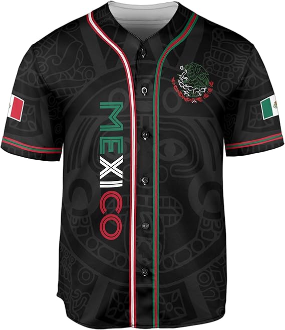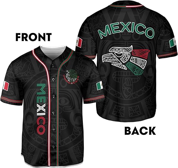 Elevate your style with this Mexico Baseball Jersey featuring a striking tribal eagle head design on the back and bold vertical “MEXICO” text on the front. The entire jersey is overlaid with subtle Aztec calendar patterns in black-on-black, giving it a layered and meaningful aesthetic. Accented with red, white, and green detailing along the piping, flag patches on the sleeves, and a modern fit, this jersey blends ancient culture with contemporary streetwear. Perfect for national pride events, cultural celebrations, or bold everyday fashion.
