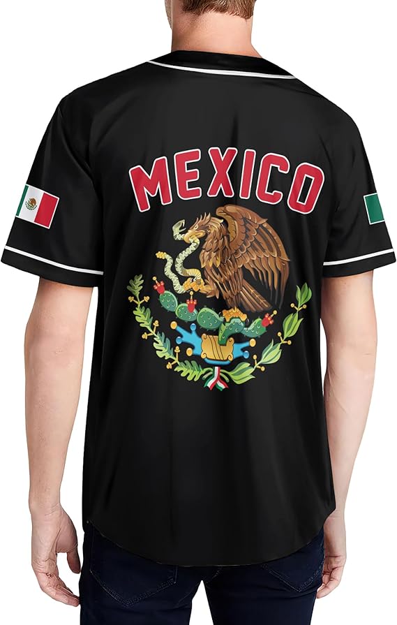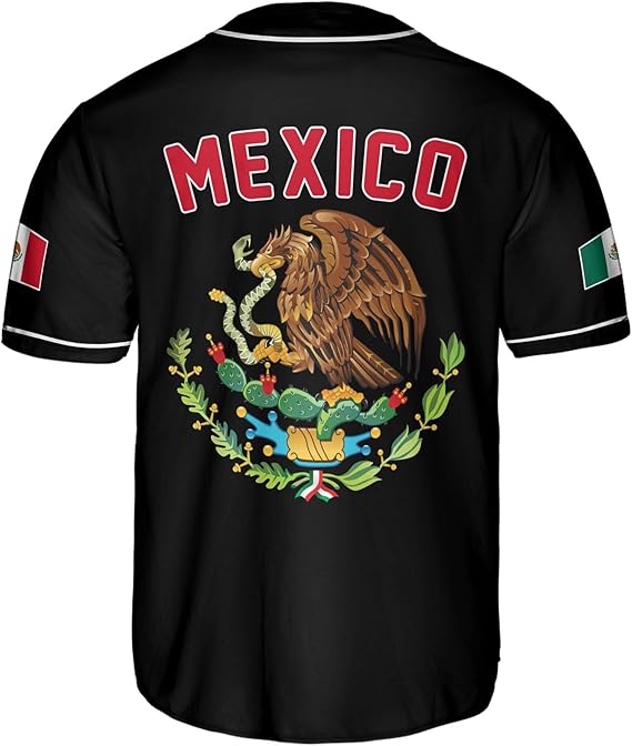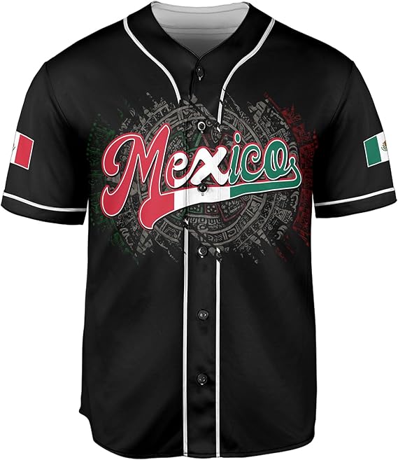 Honor your roots in bold fashion with this Mexico Baseball Jersey featuring a fusion of tradition and pride. The front showcases “Mexico” in vibrant red, white, and green script layered over an intricate Aztec calendar design, symbolizing deep cultural heritage. The back highlights the national coat of arms with “Mexico” arched above, while sleeve flag patches and clean white piping add classic baseball vibes. Crafted from soft, breathable fabric, this jersey is perfect for national celebrations, sporting events, or everyday streetwear that reps Mexico with pride and history.