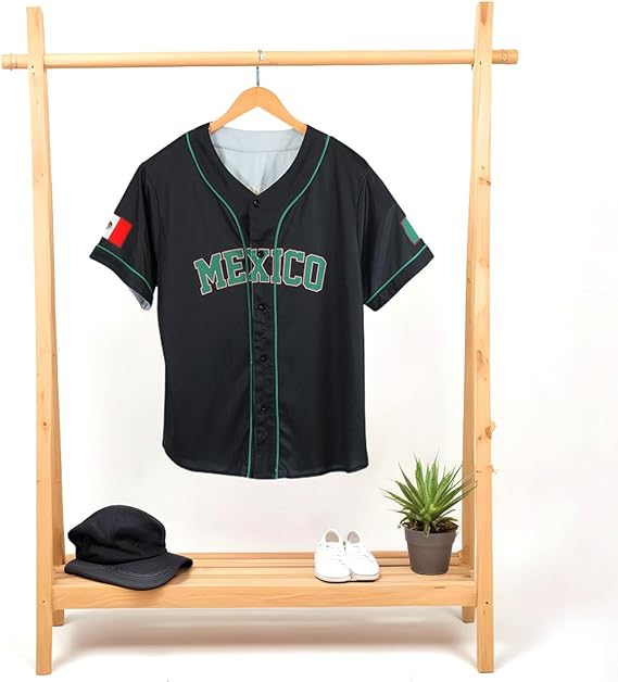 Show off your national pride with this black baseball jersey featuring a bold front "MEXICO" text and a majestic golden eagle seal on the back. The design is framed by “ESTADOS UNIDOS MEXICANOS” and colored "MEXICO" lettering underneath. Complete with Mexican flag patches on both sleeves and green piping, this jersey is perfect for patriotic events, World Baseball Classic, or everyday cultural wear.