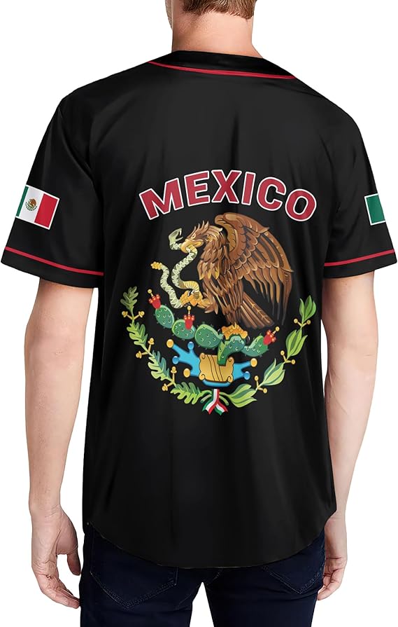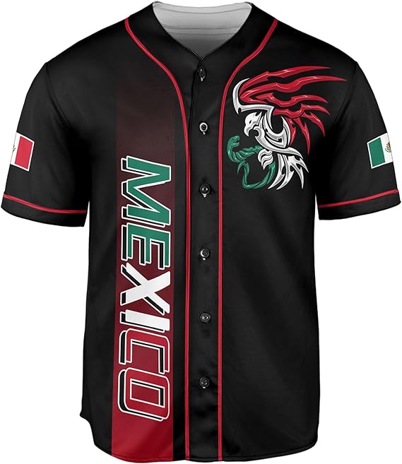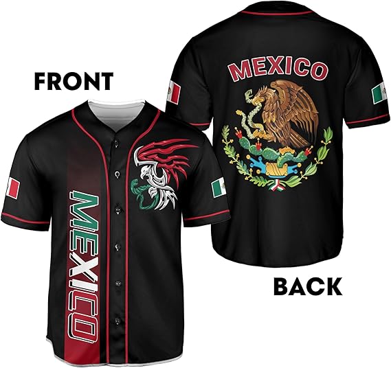 Make a powerful statement with this Mexico Baseball Jersey featuring a fierce tribal-style eagle across the chest and a vertical “MEXICO” text in bold national colors. The split-tone black and red front is trimmed with red piping for a sporty, modern look, while the back proudly displays the official Mexican coat of arms with “MEXICO” arched above. Sleeve flag patches complete the patriotic theme, making this jersey perfect for Independence Day, sporting events, or everyday streetwear that celebrates strength and heritage.