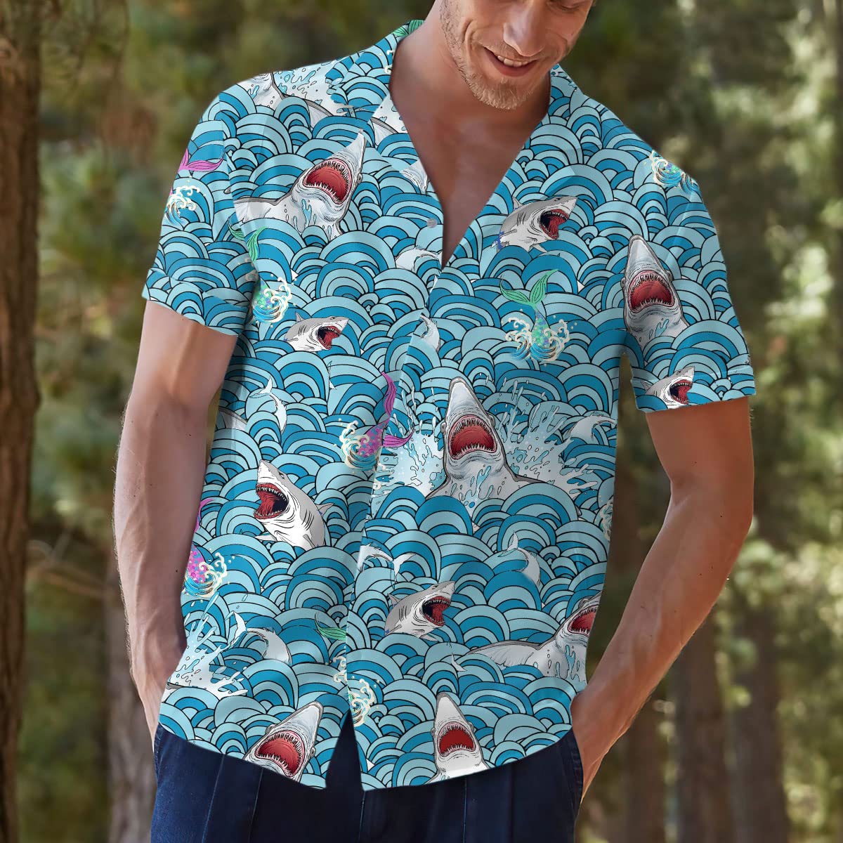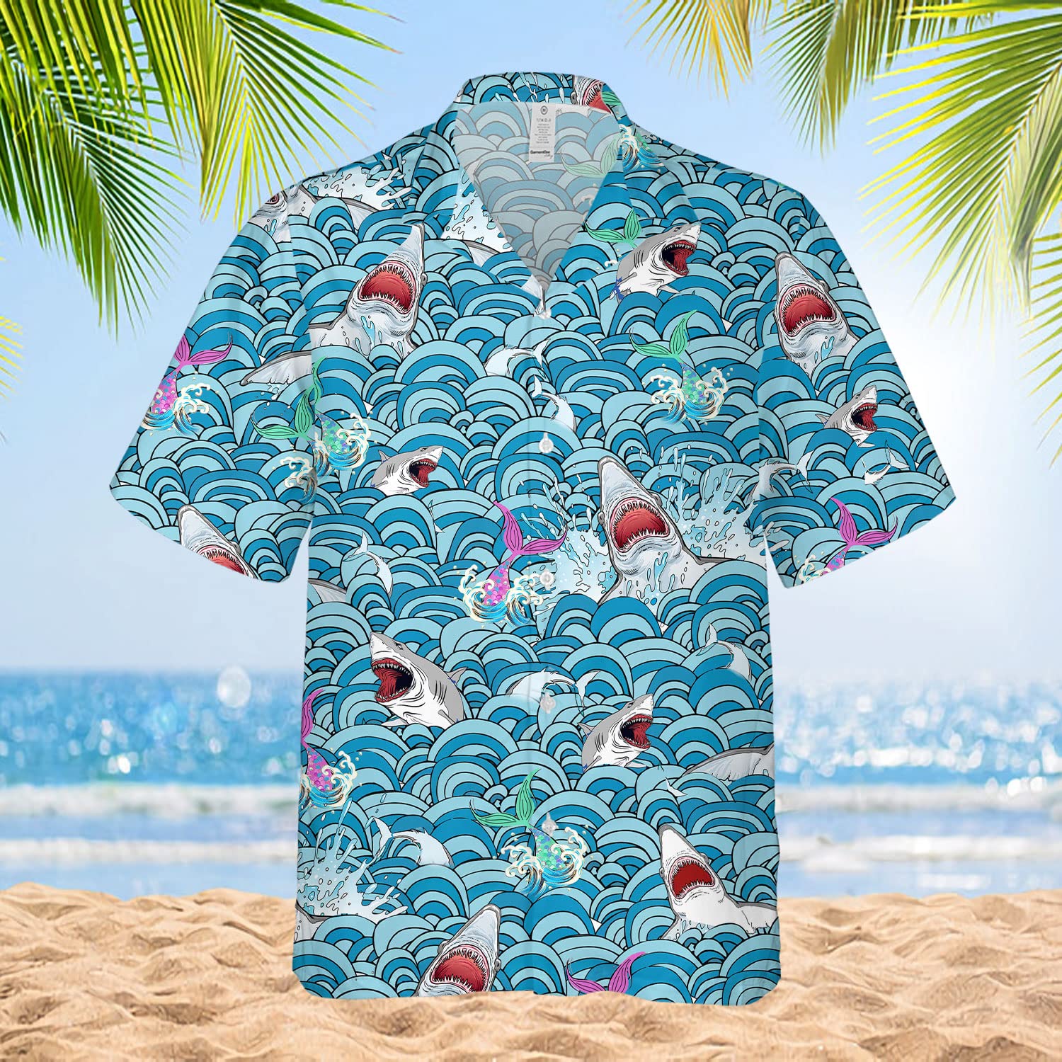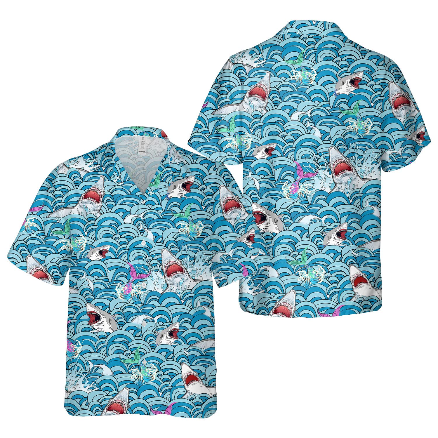Shark Attack Hawaiian Shirt – Funny Ocean Waves & Mermaid Print Aloha Shirt